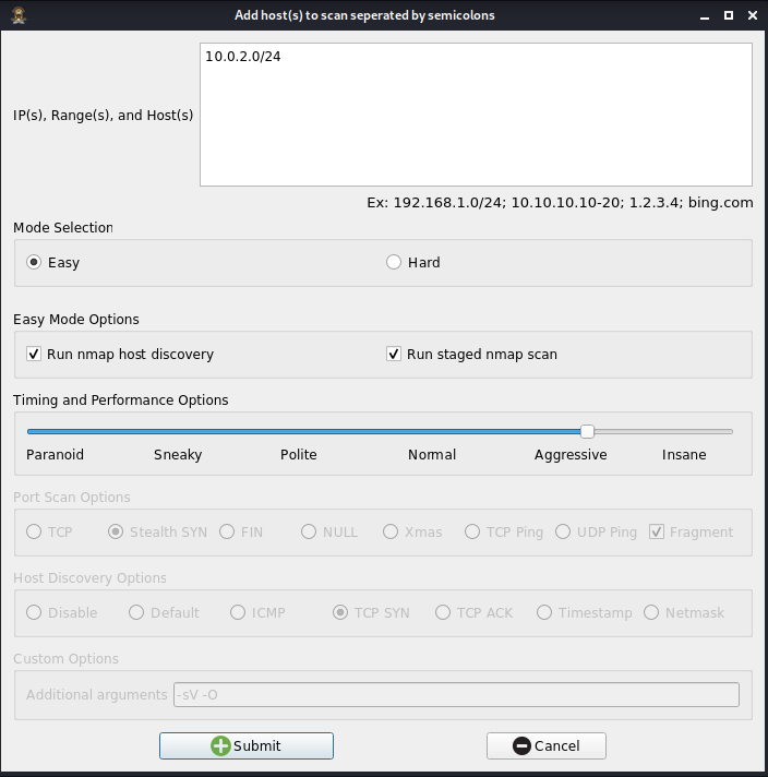Clicking on the link in the Scan -> Hosts section of the startup screen allows the inputting of target hosts. These can be specified as follows: