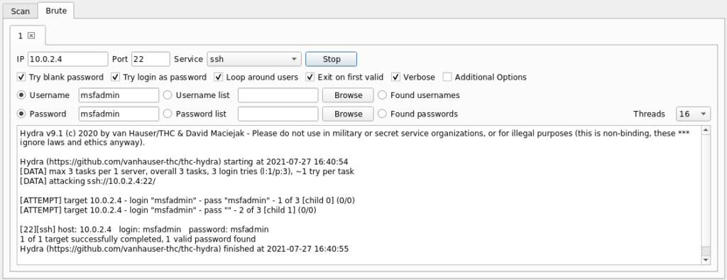 In the following example the default login credentials were run against the SSH service on a Metasploitable target: